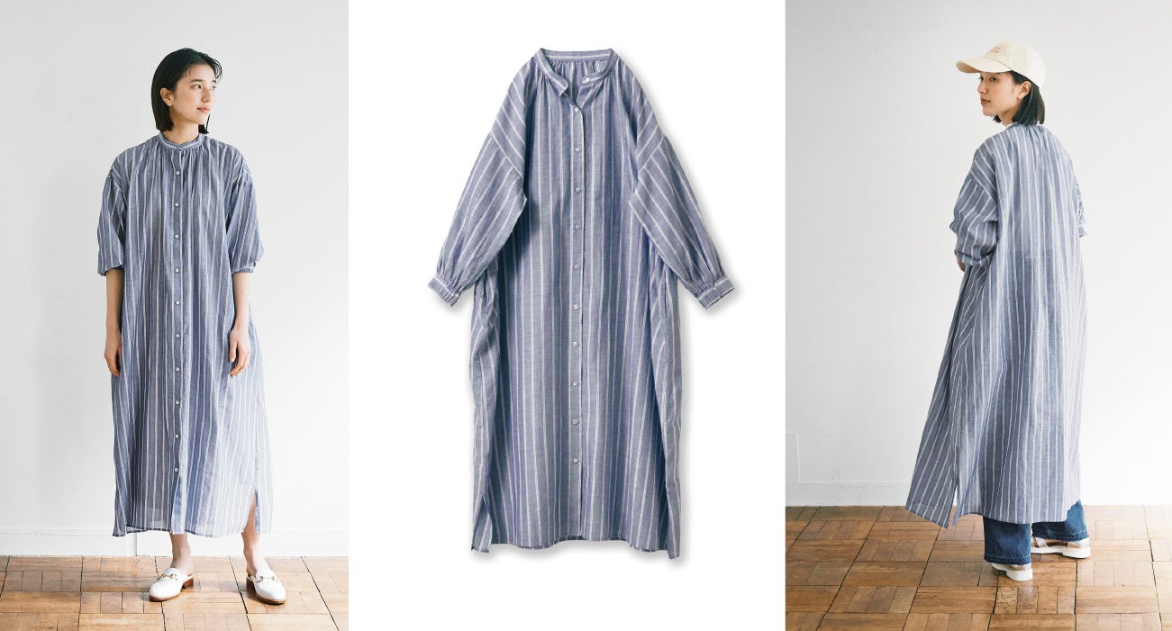 綿麻のシャンブレー地でドライな着心地のストライプワンピースです。肌へのタッチが軽く、見た目も涼やかです。スリーブは長袖なので日除けをしながら、カフスをたくしあげることで袖のボリューム感もアレンジできます。