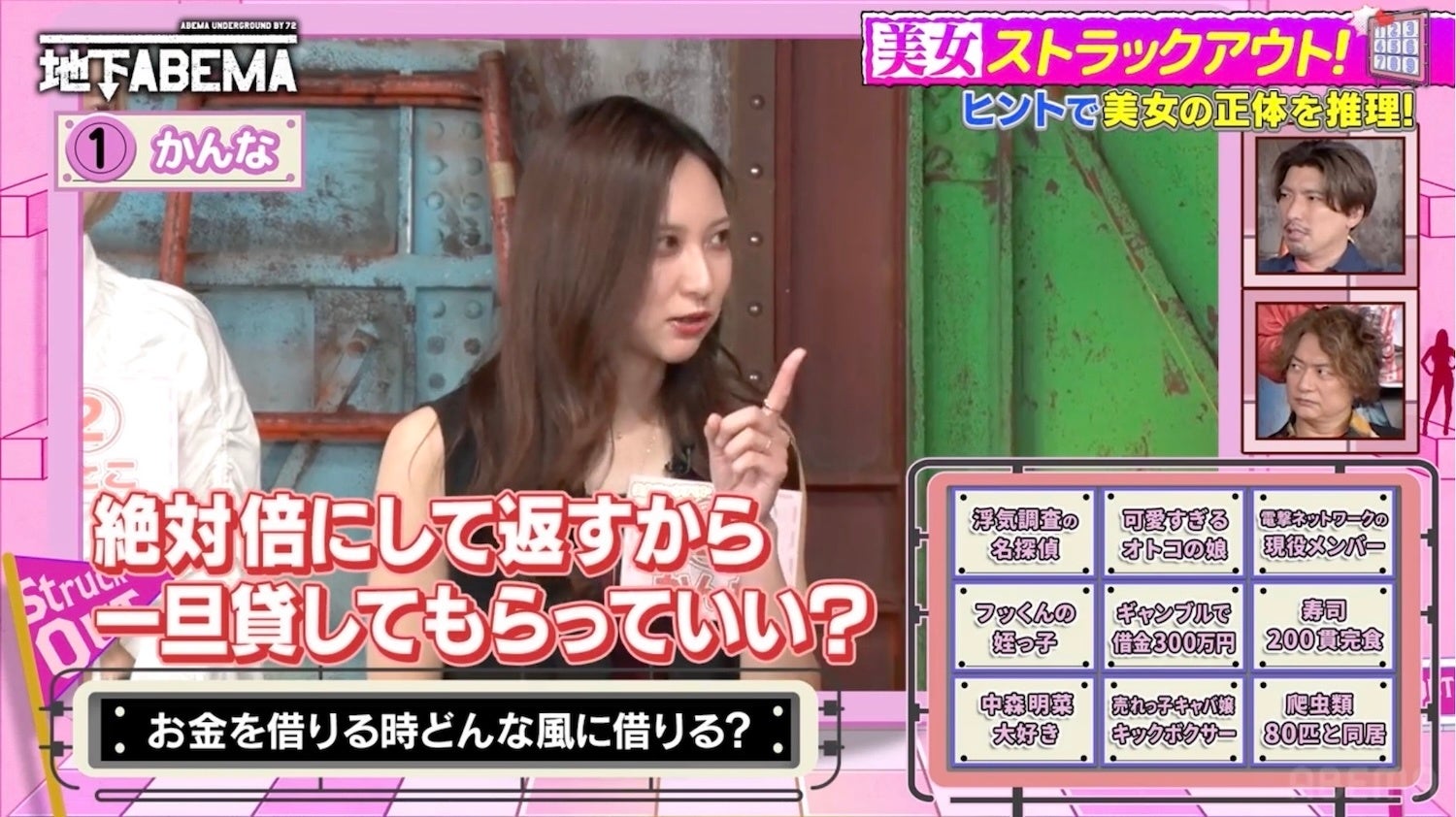 見た目だけで判断するのは至難の業であることから、スタジオのななにーメンバーは美女9名にあれこれ質問。すると1番の名札を付けたかんなさんは「お金を借りるとき、どうやって頼む?」という質問に「絶対倍にして返すから、一旦貸してもらっていい?」、「爬虫類の魅力は?」という質問には「歯を磨いたことがないのに、食事のときは口の中がめちゃくちゃきれいなんですよ…」と、機転の利いた回答を連発。香取も思わず「かんな、やべえな!」と声を上げます。さらに、浮気男性の見抜き方についてかんなさんが「とにかく優しくて、携帯を裏返しに置く人」と答えると、そのリアルな回答にみちょぱは「過去に結構浮気されてるんだ…」と同情しました。