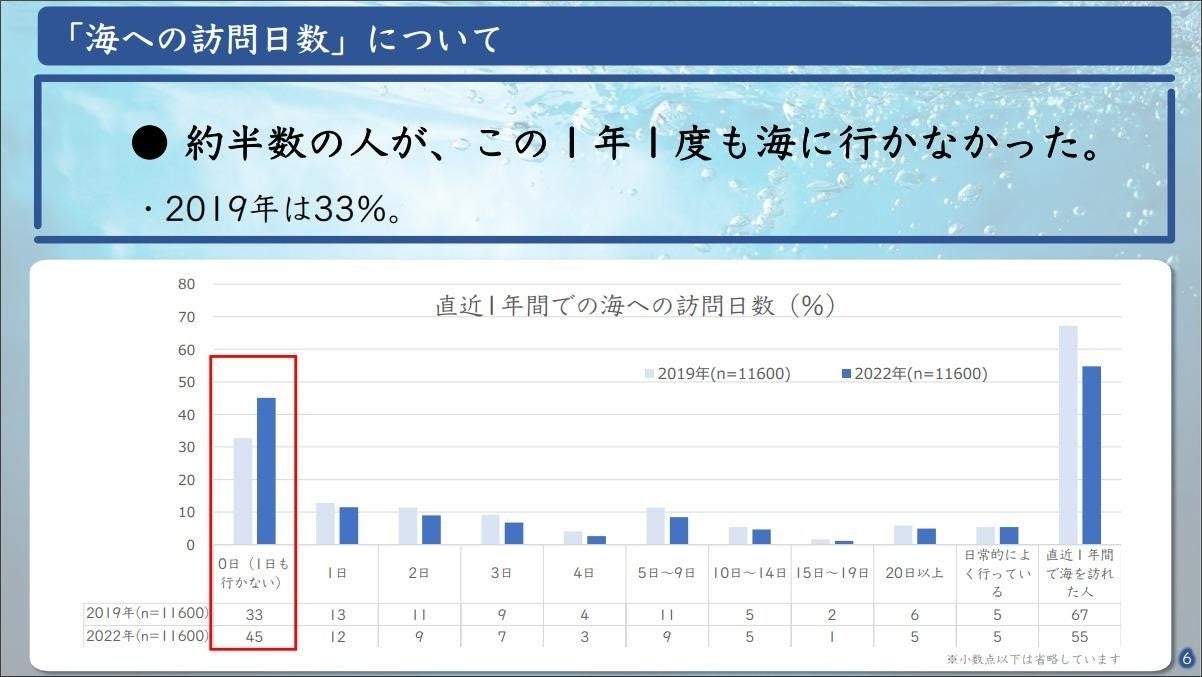 しかし、本プロジェクトに多くの方に参加いただいた一方で、日本財団が2022年に実施した海と日本人に関する意識調査では、「約半数の人が直近1年間に海に行っていない」ことが判明しています。