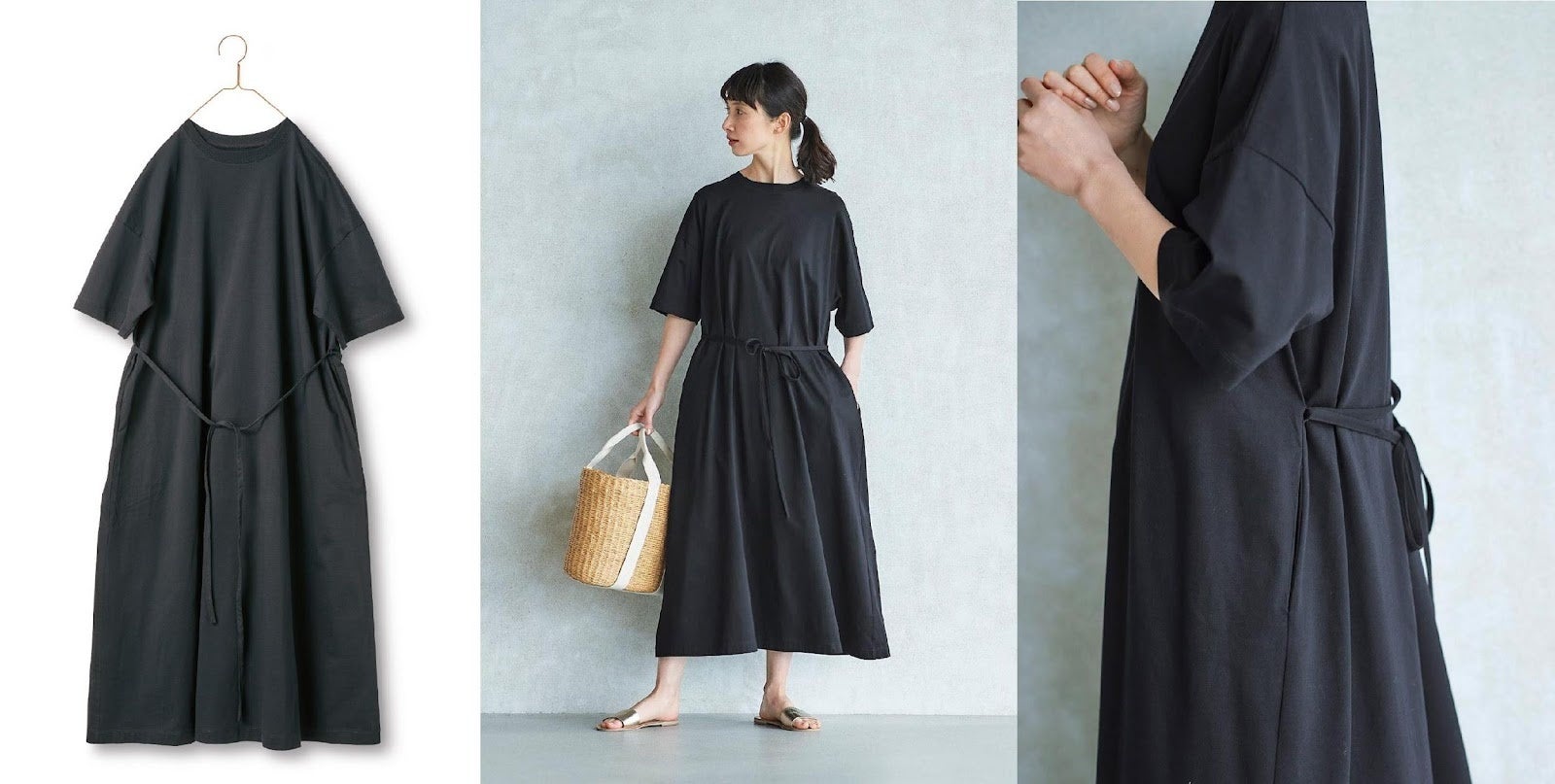 ほどよく厚みのある天じく生地を使った、落ち感のきれいなカットソーワンピースです。kazumiさんのリクエスト「オンオフどちらでも着られるワンピース」を実現するため、綿100%糸にシルケット加工をほどこして、なめらかで着心地よく、光沢感のある生地に仕上げています。リボンでウエストマークすれば、よりきれいめに見せることもできます。