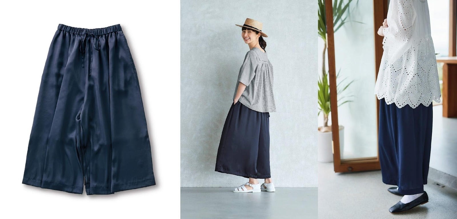 上品で大人な雰囲気の「kazumiさんのとろみパンツ」です。ポリエステル素材を使った日本製サテン生地で、光沢感と落ち感たっぷりな生地に仕上げています。ウエストは総ゴムの楽ちん仕様で、透け防止のための裏地をつけています。シンプルなデザインで、どんなアイテムにも合わせやすいワイドパンツです。