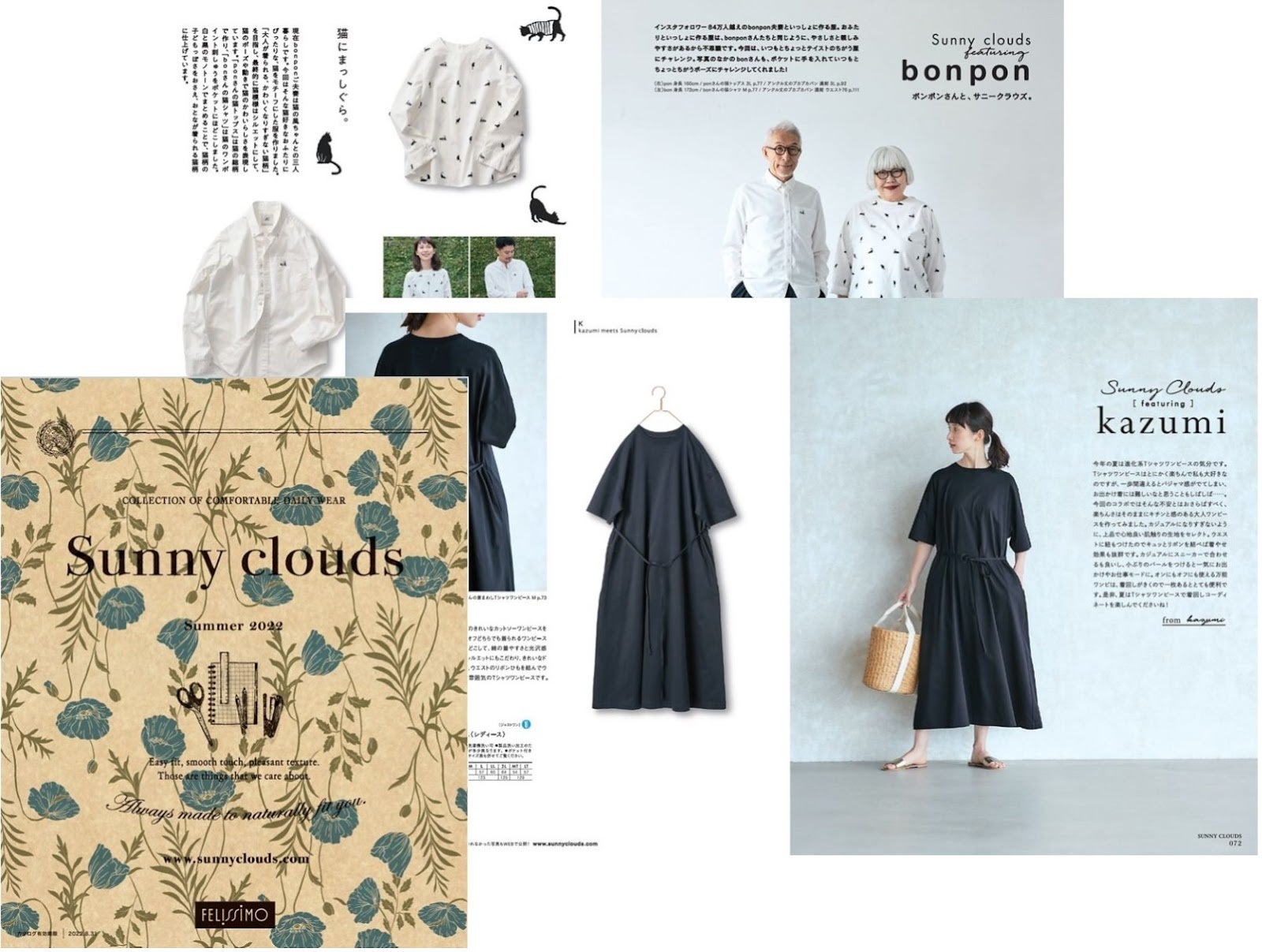 フェリシモが展開するファッションブランド「Sunny clouds [サニークラウズ]」は、ふたつのコラボレーション新作を発表、4月21日よりウェブサイトにて販売を行っています。販売アイテムはサニークラウズのイメージモデルとして、またインスタグラムでのコーディネイトやライフスタイルに多数のファンを持つモデルのkazumiさんのワンピースとセーラートップス、おしゃれなリンクコーデがインスタグラムで反響を集め、フォロワー数84万人(2022年3月現在)のbonpon夫妻の猫モチーフのトップスです。コラボシリーズ新作は公式ウェブサイトやデジタルカタログでチェックできます。