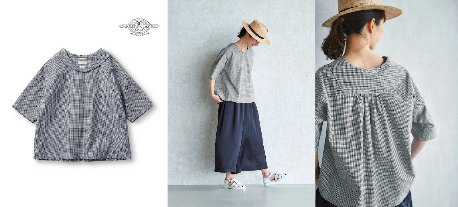 kazumiさんが衿まわりのサイズ感にこだわりながら作った、オーガニックコットン100%のセーラートップスです。オーガニックコットンは特性上、繊維長が短めのものが多いなか、希少な超長綿を用いた細糸を採用しています。ゆったりとした身幅に対して、小さめのギンガムチェックにすることで、バランスよく仕上げたトップスです。