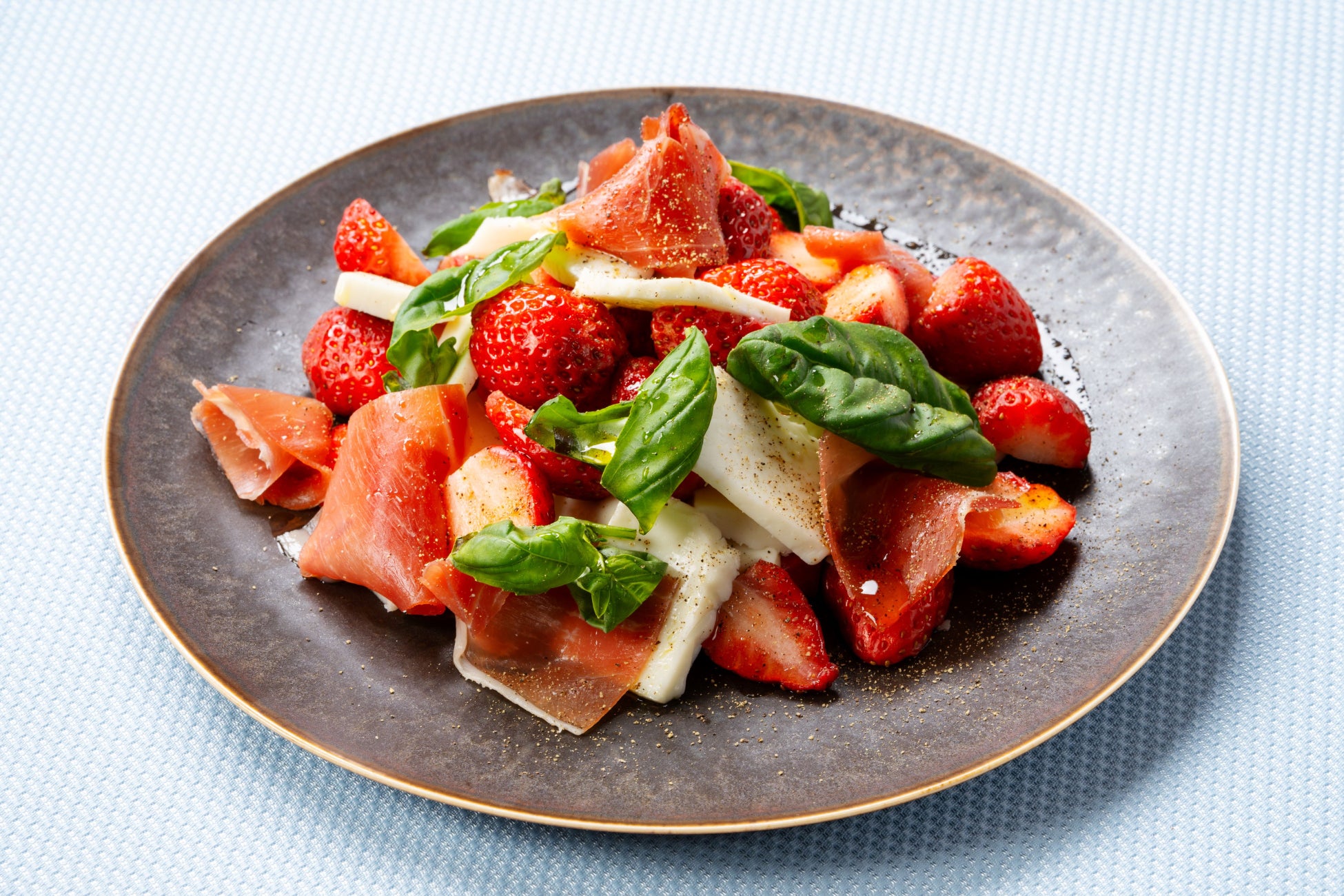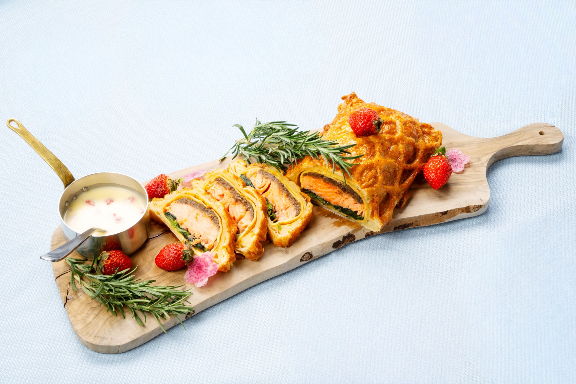 また、ライブキッチンで提供する「ローストビーフ 苺ソース添え」をはじめ、「苺と2種のチーズのカプレーゼ」や「サーモンと苺のパイ包み」など、苺の新たな魅力を引き出した料理も取り揃えました。デザートだけでなく、お料理でも苺をお楽しみいただける、ホテルならではの華やかなランチビュッフェです。