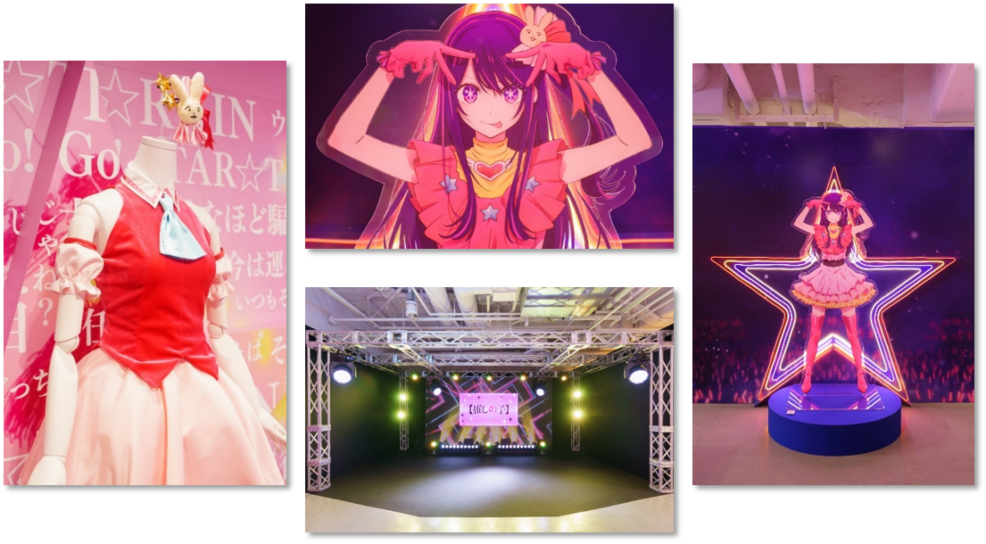 本展では、TVアニメ『【推しの子】』 に使用された絵コンテ、原画の複製展示の他、物語の中で着用している衣装の再現展示、ライブステージ映像コンテンツ、作中の印象に残る様々なシーンを再現し、体験が出来る多くのフォトスポットなどをお楽しみ頂けます。