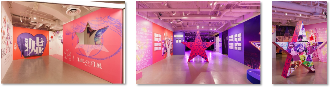 本展では、現在放送中のTVアニメに使用された絵コンテ、原画の複製展示の他、物語の中で着用している衣装の再現展示、ライブステージ映像コンテンツ、作中の印象に残る様々なシーンを再現し体験が出来る多くのフォトスポットなども展示します。さらに音声ガイド付チケットを購入すると、会場限定のスペシャルな「アイ」の音声で展示をご案内します。また、会場では展覧会開催を記念したオリジナルグッズも販売予定です。