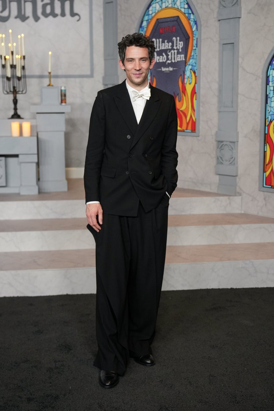 ジョシュ・オコナーは、ブラックウールのピークドラペルダブルブレストジャケットに、ワイドパンツ、ホワイトのコットンシャツ、ホワイトシルクの蝶ネクタイ、そしてブラックレザーのダービーシューズを合わせ、登場しました。