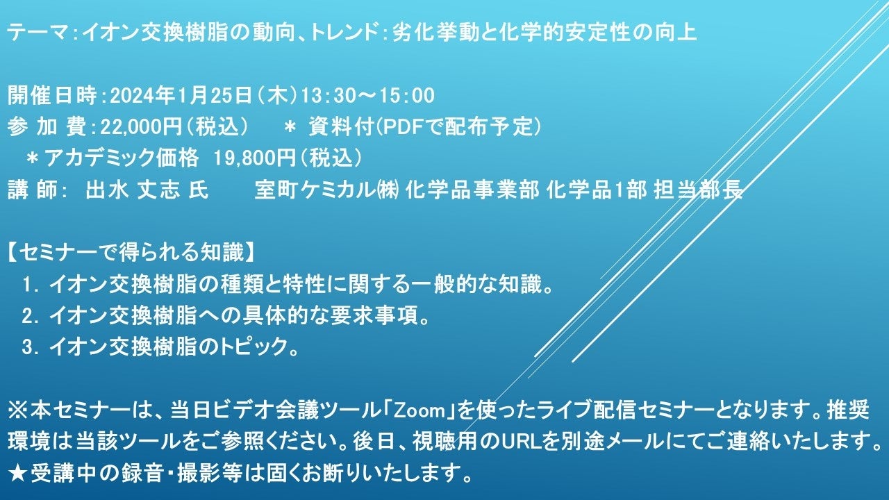 【ライブ配信セミナー】イオン交換樹脂の動向、トレンド:劣化挙動と化学的安定性の向上 1月25日(木)開催 主催:(株)シーエムシー・リサーチ
