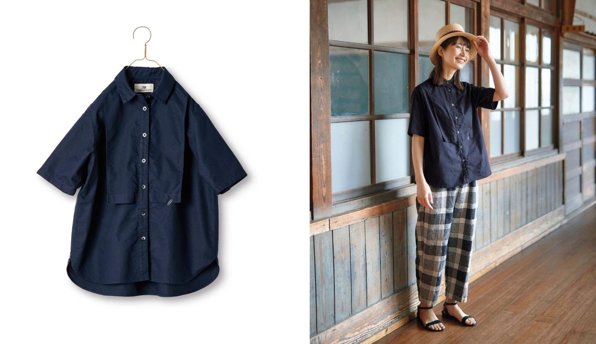 クリップをモチーフにしたシャツとワンピースです。紺色の無地で仕立て、シャツは胸あて部分に、ワンピースはポケット部分に小さなクリップの刺しゅうをあしらっています。あえて浮いたような胸あてとポケットにすることで、本当にクリップで留めているかのようなデザインに仕上げています。