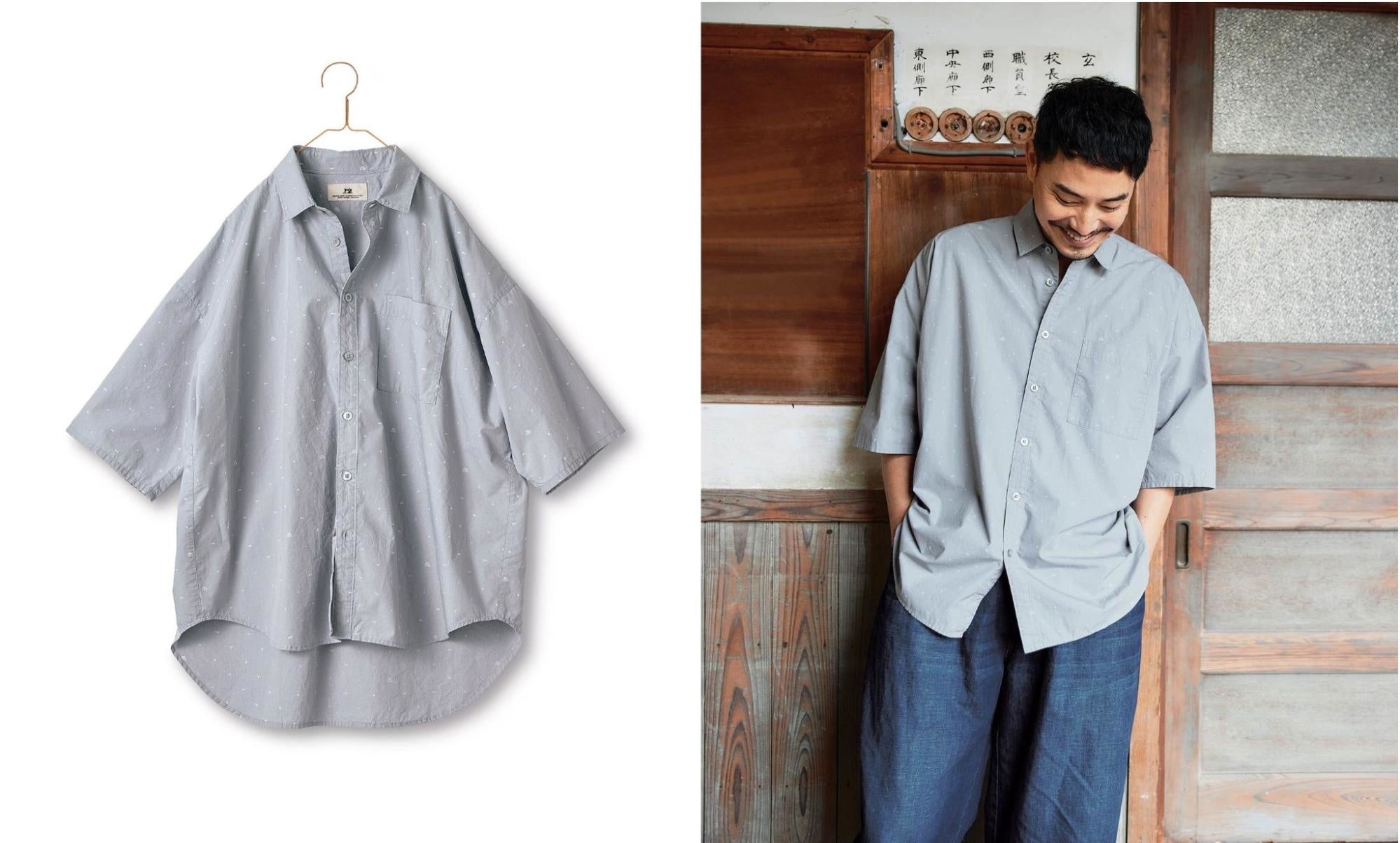 電卓のボタンに書かれている数字や記号などを散りばめたセーラーシャツとメンズシャツです。ベース生地をグレー、文字を白にすることで、子どもっぽくなりすぎない落ち着いた雰囲気に。高密度のさらりとした風合いの生地も、電卓の質感からイメージしたものを採用しています。