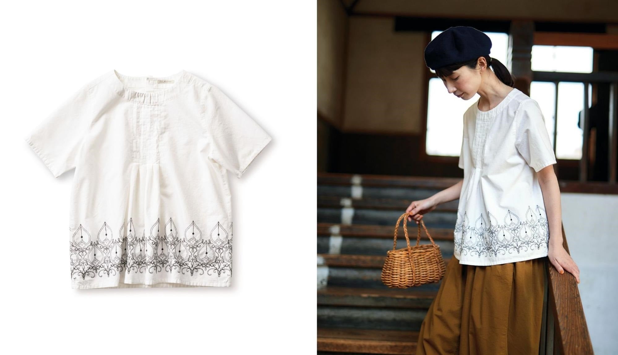 文房具のアイコン的存在「万年筆」のペン先をモチーフにした、刺しゅうブラウスです。すそに360°ほどこした繊細な模様が、真っ白いコットン生地に美しく映えます。前身ごろのプリーツや少し広めの衿ぐりなど、涼しさにも配慮したシルエットです。