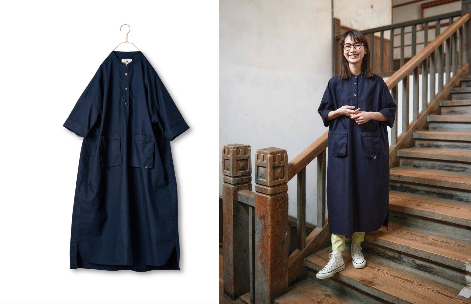 新作の「方眼紙ワンピース」は方眼紙のマス目を、できるだけ正方形になるよう打ち込み本数を調整し、チェック柄にした生地で仕立てたアイテムです。ゆったりとしたドロップショルダーデザインで、袖口はタックを入れた立体的なシルエットに仕上げています。
