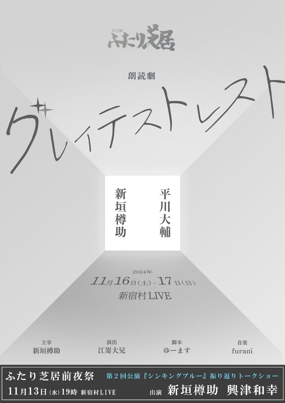 声優・新垣樽助が主宰する朗読劇「ふたり芝居」 第3回公演『グレイテストレスト』上演決定 平川大輔と役替わりの二人芝居 前夜祭には興津和幸が登場