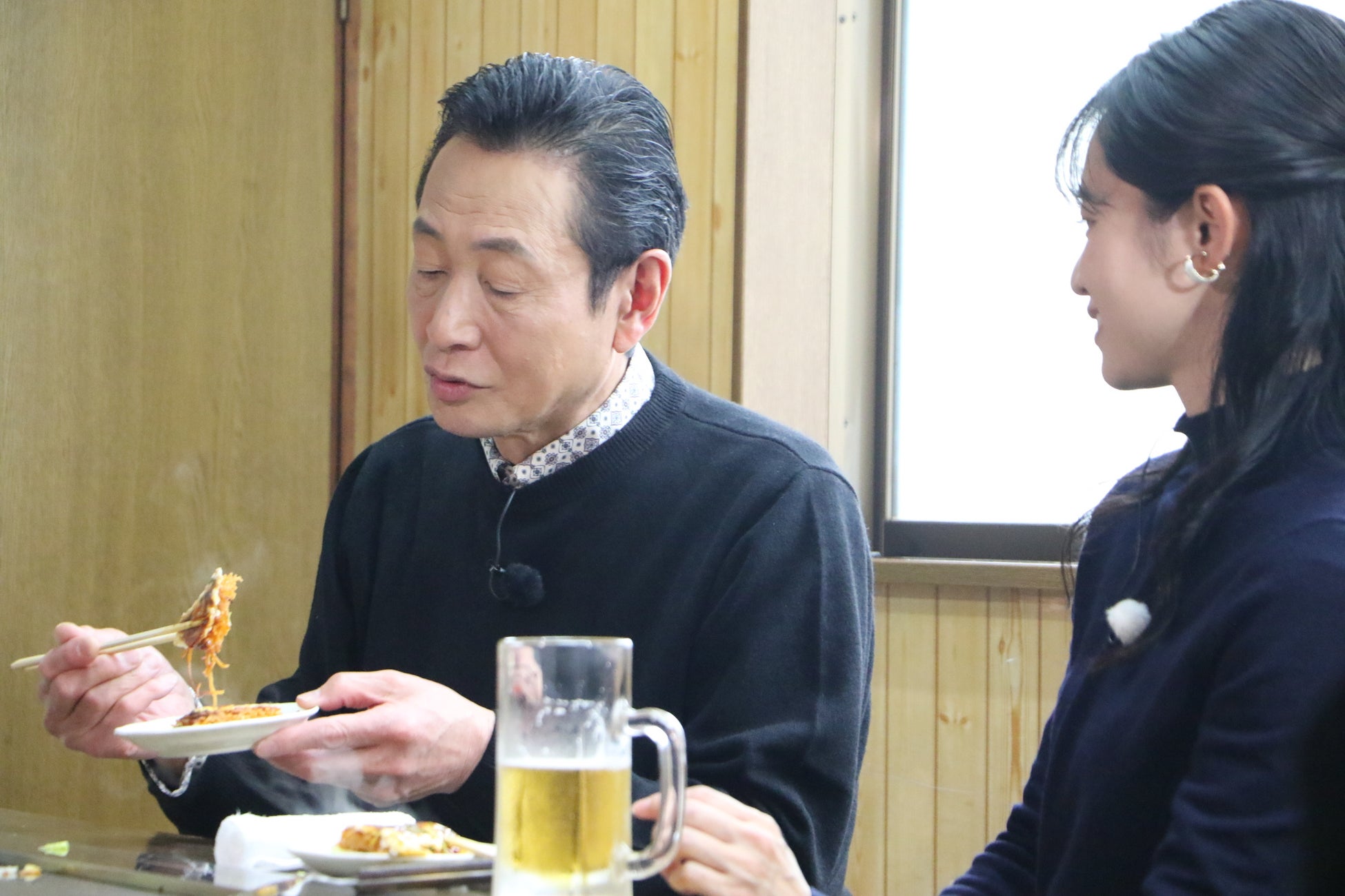 江草商店の斜め前にあるお好み焼き屋【宝来屋(ほうらいや)】。まずは生ビールで乾杯!『肉玉唐麺』は、「とんでもなくいい辛さ!」と三田村。もちもちカリッと食感のバランスも絶妙!おいしくて気分がよくなったふたりからダジャレが飛び出します。