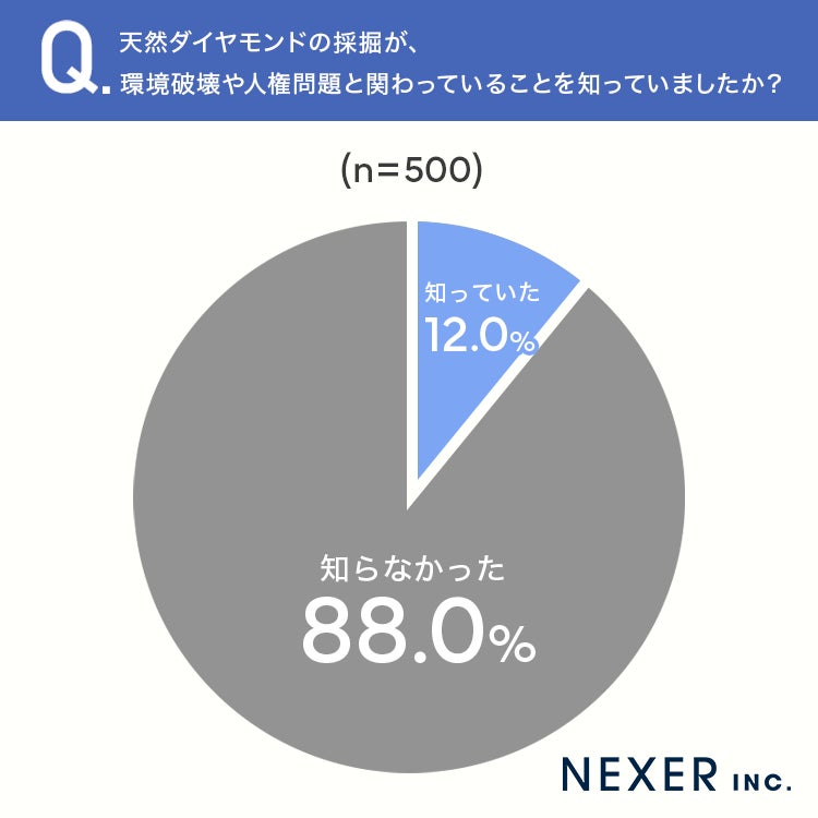 今回の調査では、天然ダイヤモンドの採掘が引き起こす環境破壊や人権問題について、88.0%の人が「知らなかった」と回答し、これらの課題への認知度が依然として低いことが明らかになりました。