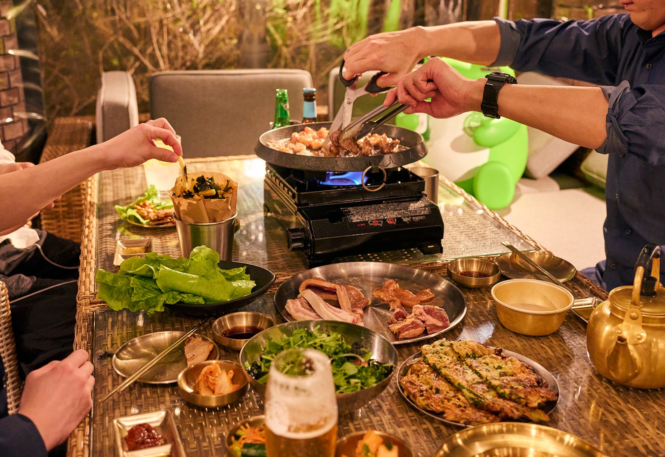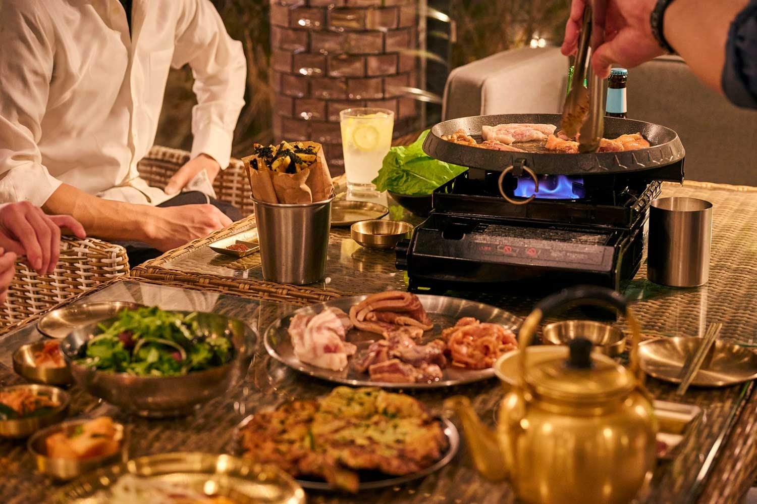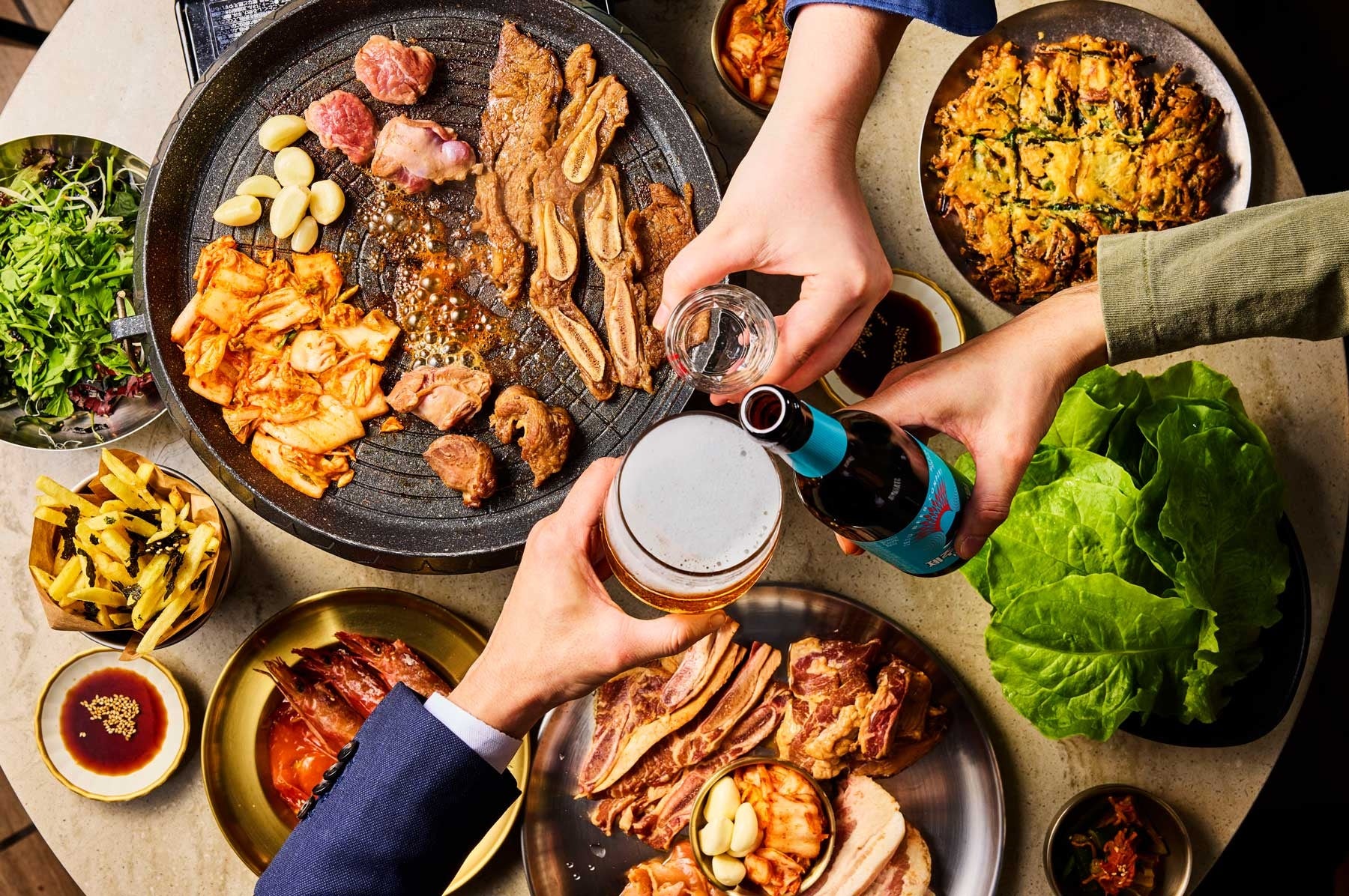 洗練された屋根付きテラスで、熱々の韓国BBQと多彩なドリンクを満喫。外で過ごすのが心地よいこの季節、デートや女子会、会社帰りの飲み会にもぴったり。韓国グルメとともに、韓国ビールやチャミスルを贅沢に楽しめる特別なひとときをお届けします。天候を気にせず、心地よい風を感じながらリラックスしてお過ごしいただけます。