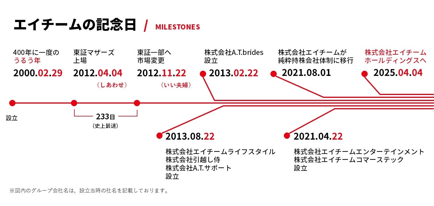 有限会社エイチームとして2000年2月29日に設立した当社は、これまで創造性と技術力を駆使して多様なITサービスを創出し、世の中をもっと便利に、もっと楽しくするサービスの提供に努めてまいりました。2013年からはグループ経営戦略として子会社化を推進することで、各グループ会社社長の経営経験を増やすとともに、意思決定のスピードと機動力をより高め、グループ全体の事業成長の向上を図ってまいりました。2021年8月には、ホールディングスとしての機能を強化するために純粋持株会社体制に移行しております。