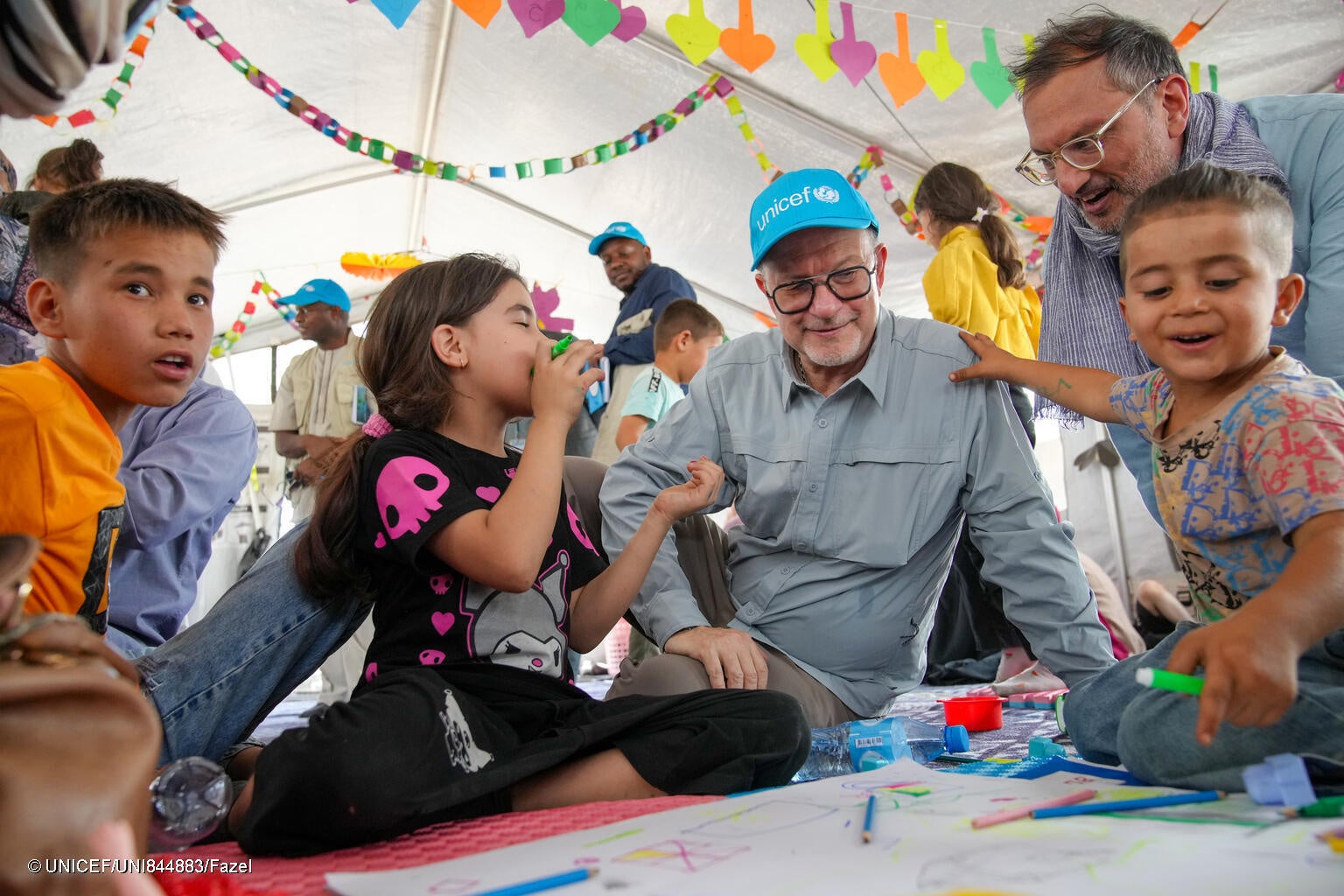 西部ヘラート近郊のイスラムカラ受け入れセンターにユニセフが設置した「子どもにやさしい空間」で、子どもたちと交流するユニセフ事務局次長のテッド・チャイバン(アフガニスタン、2025年8月5日撮影)