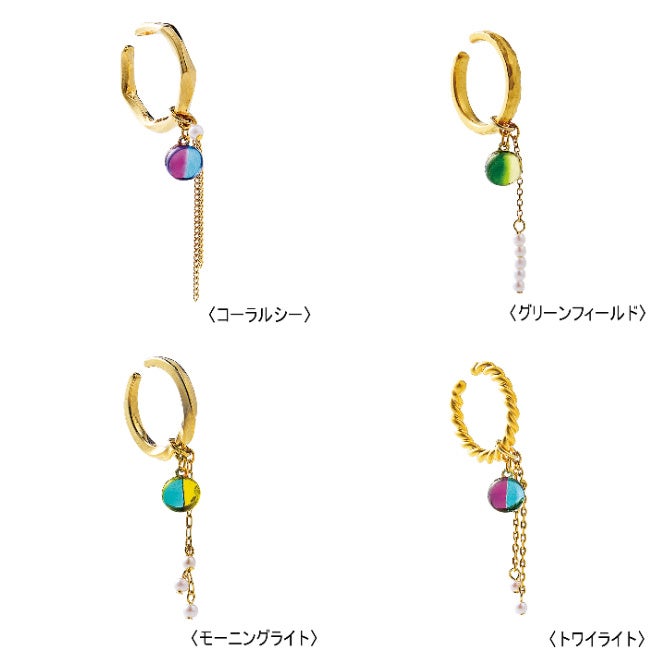 2色を合わせて仕上げたガラスは、それぞれが微妙に違う世界にひとつだけのものです。イヤカフ単品でシンプルに仕上げたり、チェーンでゆらゆらと動きを出して華やいだ耳もとを演出したり、コーデやその日の気分に合わせて違った雰囲気を楽しめます。4種類全部集めて自由に組み合わせるのもおすすめです。