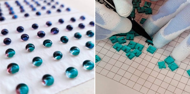 見る角度によって色が変わる、神秘的なガラスの粒は、虹色の箔を塗装したダイクロガラスと色ガラスを手仕事でカットして貼り合わせ、高温で焼成する「ヒュージング」という手法によるものです。制作は、ふたつの福祉事業所「ゆとり作業所」さんと「れもんワークス」さんです。