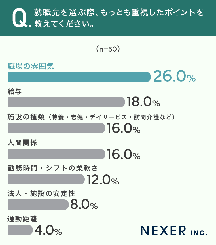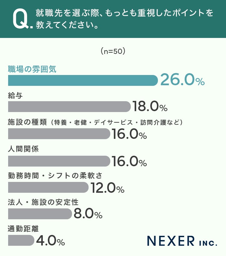 続いて、介護職の就職先を選ぶ際にもっとも重視したポイントを聞いてみました。
