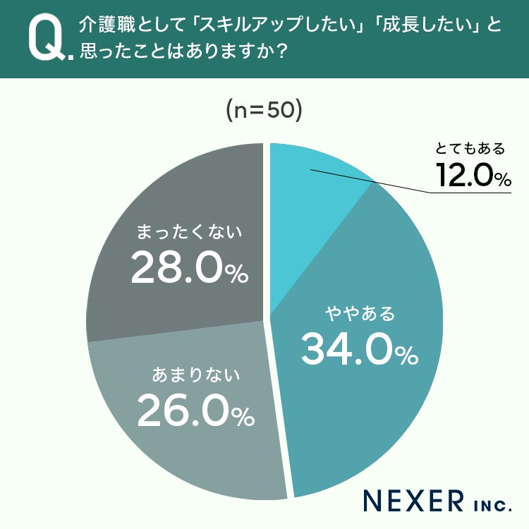 スキルアップに対する意欲は職場環境やキャリア志向によって大きく影響されますが、それでも約半数の人が「成長したい」と感じていることは、介護業界における人材育成の重要性を示しているといえます。