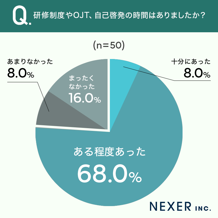 続いて、研修制度やOJT、自己啓発の時間があったかどうかを聞いてみました。