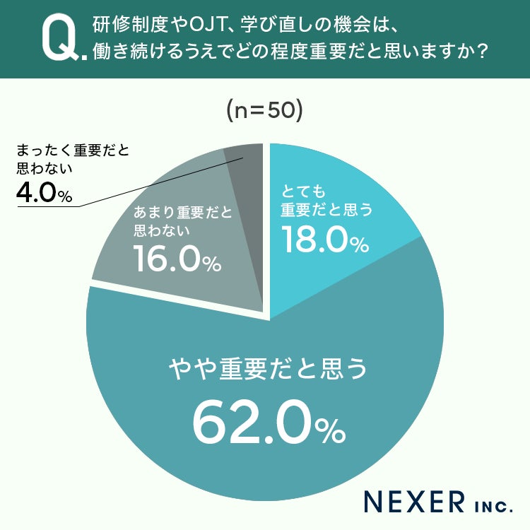 最後に、研修制度やOJT、学び直しの機会が働き続けるうえでどの程度重要だと思うかを聞いてみました。