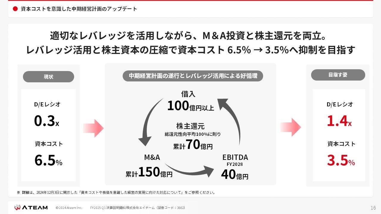 本資料(FY2025 Q1決算説明資料)は、その3日前に開示した「資本コストや株価を意識した経営の実現に向けた対応について」に記載している内容について、機関投資家・個人投資家にわかりやすく伝えるためにビジュアライズしたものです。決算説明資料に配置することで、成長戦略遂行の蓋然性及び実効性を高めることを目的としています。レバレッジが効いていない状態で資本コストが高止まりしている状況から、借入を行いD/Eレシオを下げ、株主還元も併行して行うことで資本を圧縮しWACCの低下を狙います。借入によるM&Aへの投下と、それによるEBITDAの増加を狙いさらに借入枠を増やすという好循環を作りだすというメッセージを込めています。