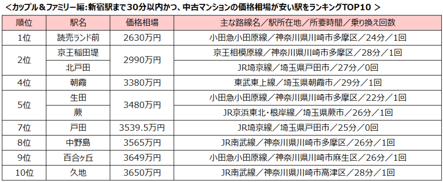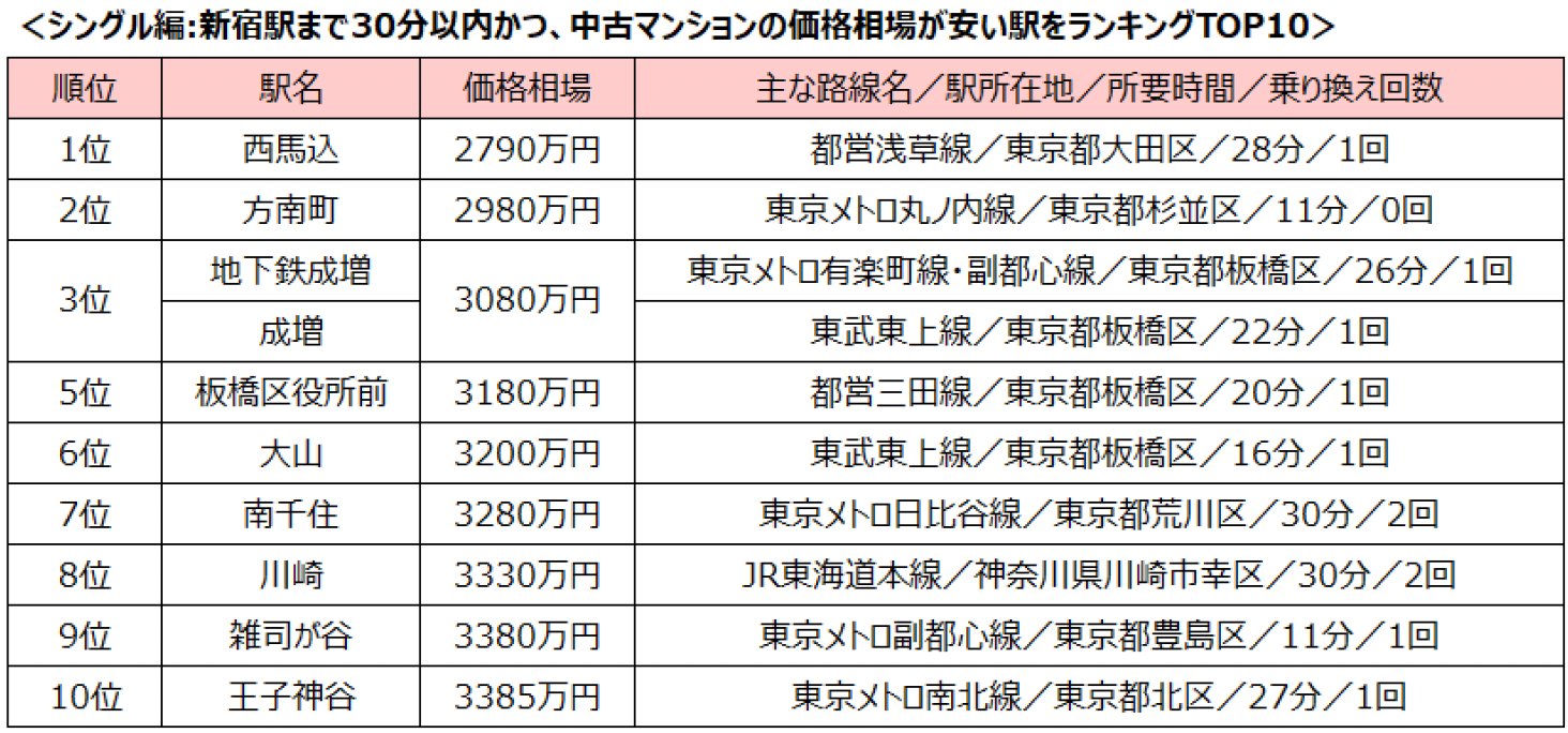 新宿駅まで電車で30分以内、中古マンション価格相場が安い駅ランキング2024「シングル向け」は所要時間11分の駅がTOP10に!「カップル・ファミリー向け」は川崎市多摩区が最多ランクイン