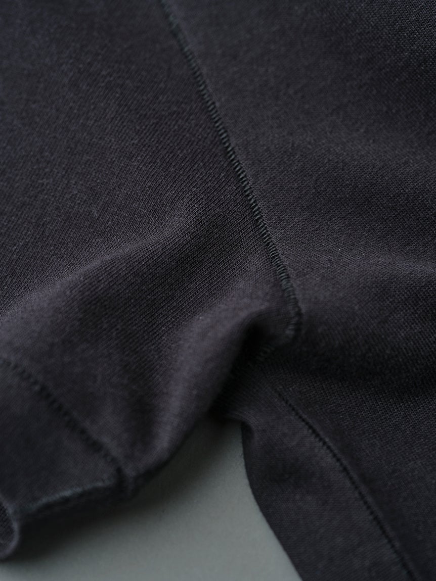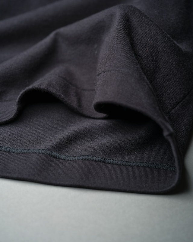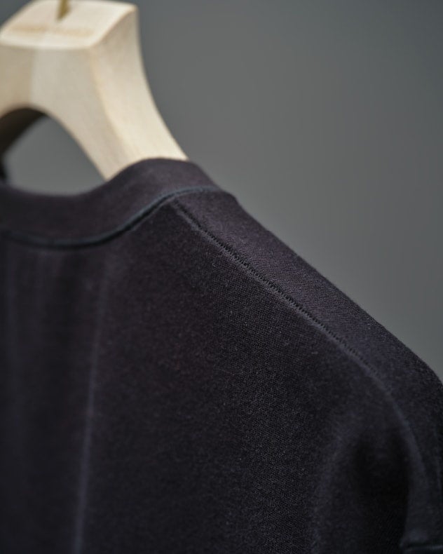 肩、袖、脇はぎは「目出しロック」仕様。一度縫製してから縫い目を開く為、表から見えるつなぎ目が特徴的な縫製手法。縫い代が細いため、肌当たりが気になりにくいのが特徴。縫製糸を使い分け、表には糸毛羽が無いスパン糸を使用することでスッキリとした見た目になり、肌面にはふわっとしたウーリー糸を使用しているため、肌へのストレスを軽減。