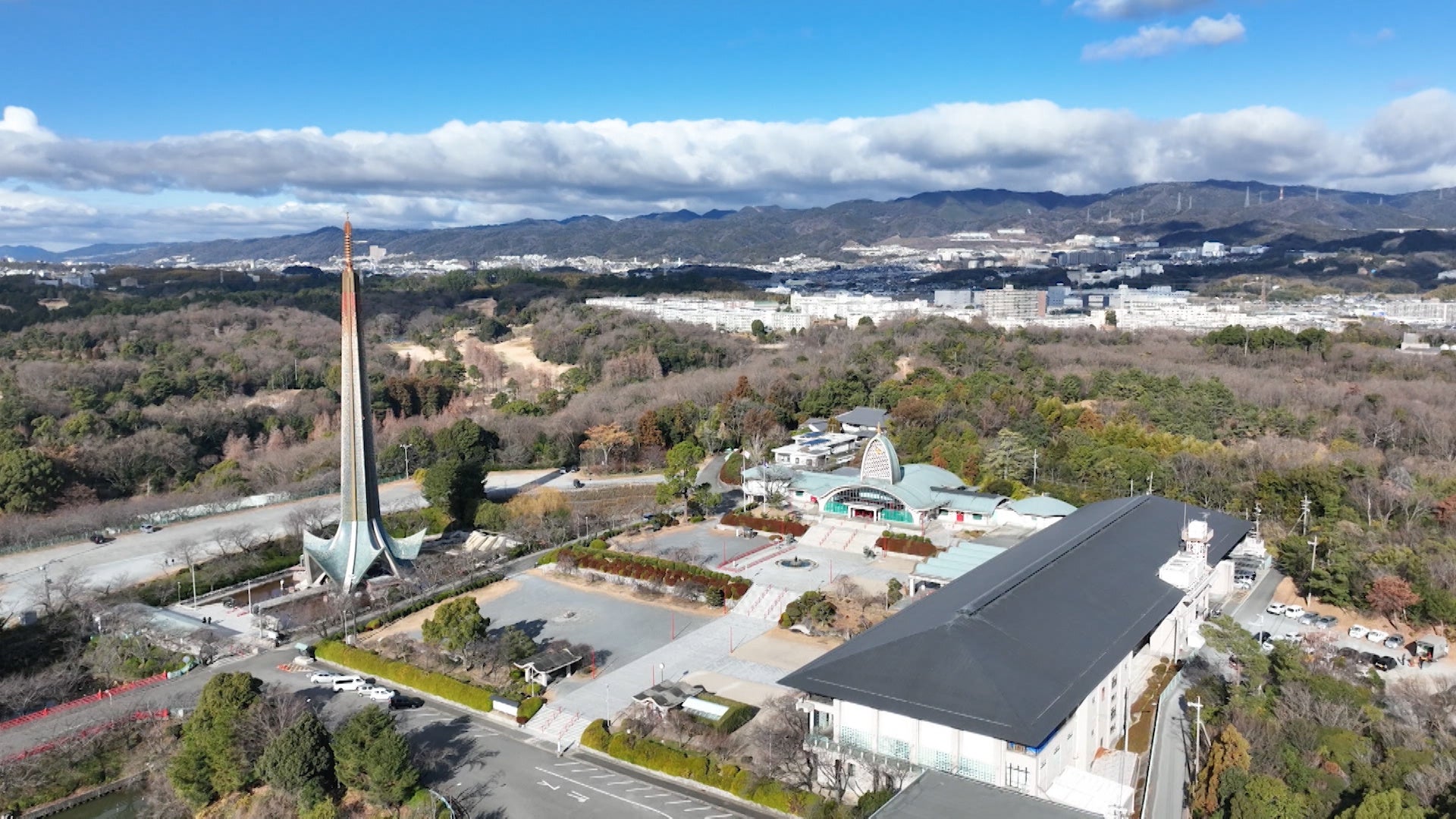名神高速道路の高槻JCTから豊中方面へと車を走らせ、茨木市に入った矢先、正面の山に“突き出る”謎の巨大建造物が……!