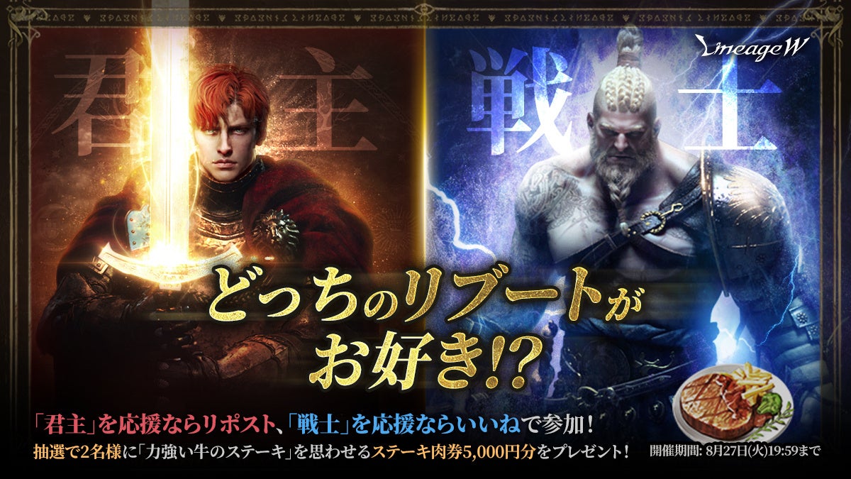 リネージュWの「戦士&君主リブート」を記念して、ステーキ肉券5,000円分を抽選で2名様にプレゼントします。