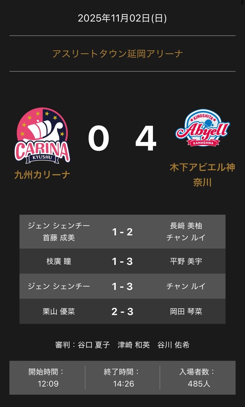 ノジマTリーグ 2025-2026シーズン 公式戦 11月2日開催 九州カリーナ vs 木下アビエル神奈川 試合結果