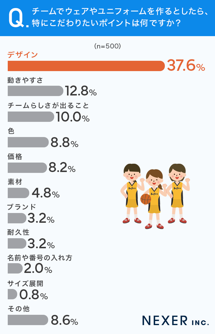 チームウェアを作る際にこだわりたいポイントとしては「デザイン」が37.6%で最多となり、次いで「動きやすさ」「チームらしさが出ること」が上位に挙がっています。