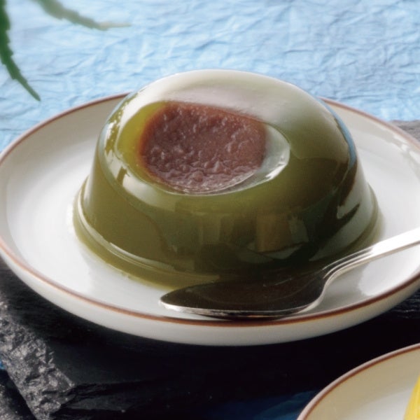 日本茶の繊細な香りとうまみを、つるんとなめらかなゼリイにしました。甘さ控えめの小倉あんと、もちっとした白玉を添えています。