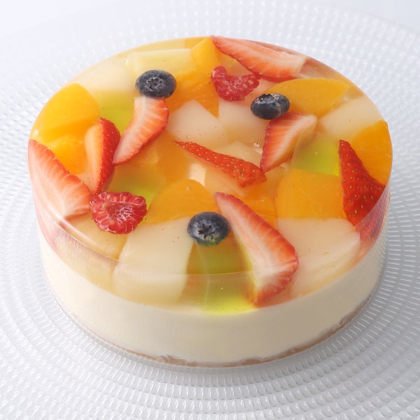 彩り華やかなフルーツをたっぷりと閉じ込めたゼリーの下には、まろやかなバニラのババロワとクッキー生地。