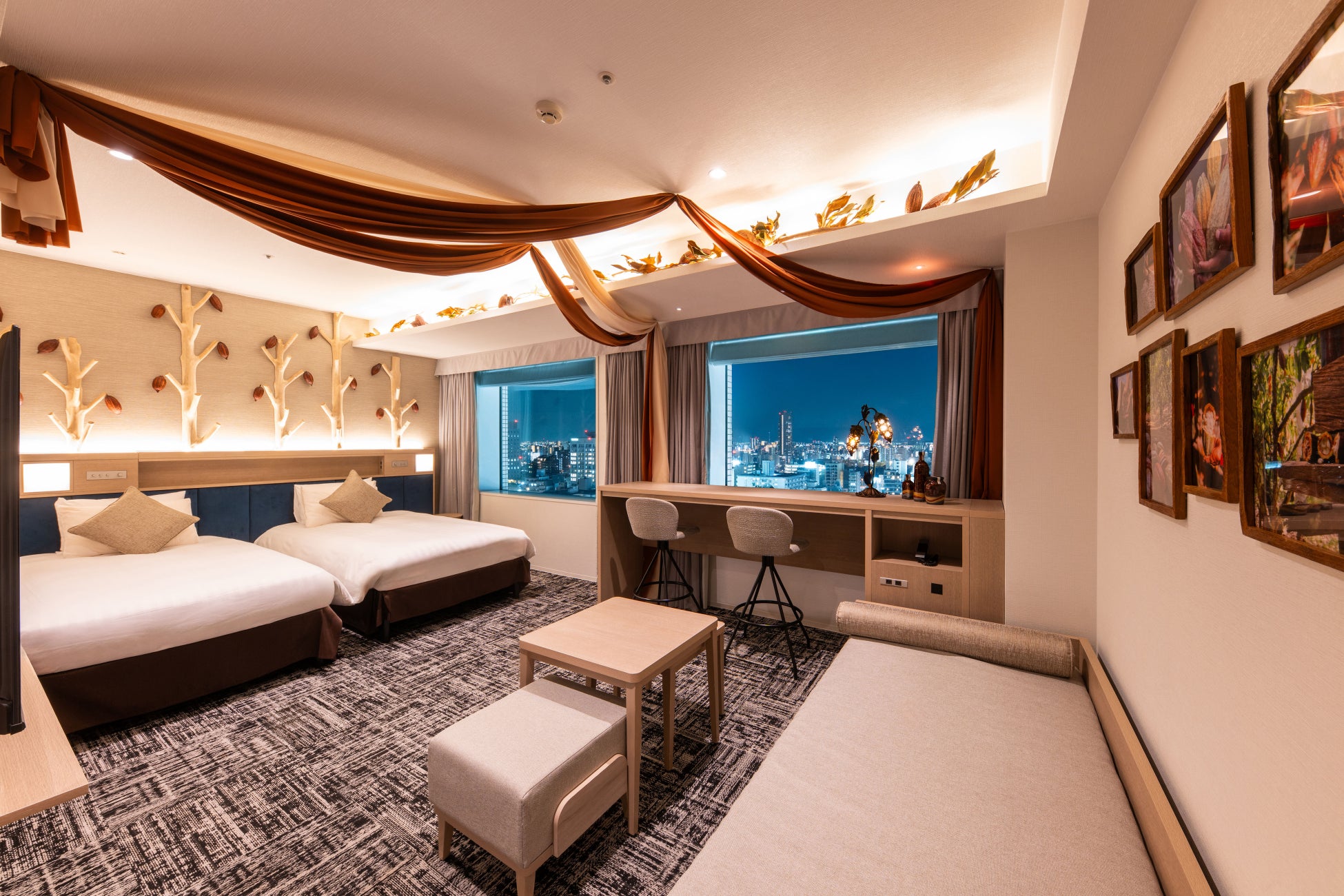 本プログラムの第一弾として、ロッテシティホテル錦糸町のデラックスツインルームの1部屋を、株式会社garage(愛知県豊橋市、代表:二村 昌彦)のプロデュースにより、ドライカカオポッドの持つ素材の魅力を存分に活かしてルーム内を装飾。内装から、カカオポッドランプなどのアイテムを散りばめた洗練された空間に改装し、期間限定で展開します。さらに、バレンタインシーズンを直前に控え、チョコレートやカカオをテーマにした期間限定メニューもご提供します。「本物のカカオ体験」をテーマに、カカオをもっと身近に感じていただきながら、上質で洗練された空間をぜひ体験していただければと考えております。
