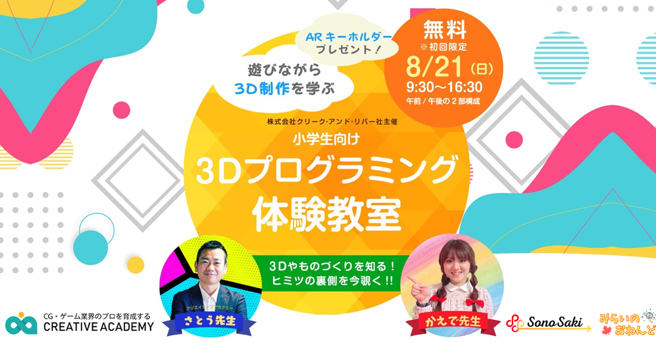 株式会社クリーク・アンド・リバー社(C&R社)が運営する「C&R Creative Academy」は8月21日(日)、株式会社SonoSakiの協力のもと、小学生を対象とした3DCGプログラミング教室「みらいのおねんど特別教室」を開催いたします。