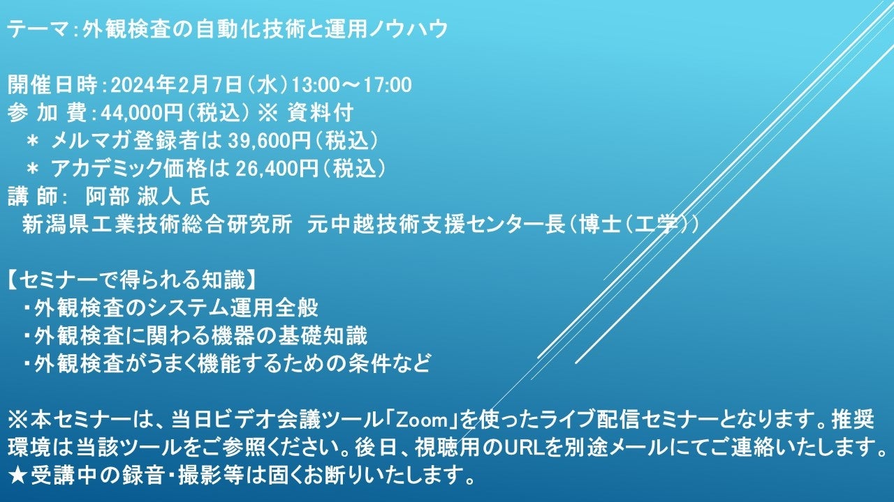【ライブ配信セミナー】外観検査の自動化技術と運用ノウハウ 2月7日(水)開催 主催:(株)シーエムシー・リサーチ