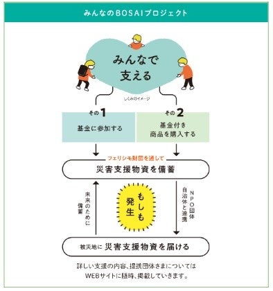 フェリシモは、1995年に発生した阪神淡路大震災以降、防災と災害復興支援への取り組みを推進しており、これまでの活動を未来につなげる「みんなのBOSAIプロジェクト もしもしも」を始動しました。もしもの時に「わたしを守る」備蓄提案(自助)と、「被災地をみんなで支える」基金(互助)の相互補完的な2軸を、多様化するライフスタイルにあわせて継続的にデザインしていきます。東日本大震災の被災経験から防災事業を展開する『株式会社ワンテーブル』(宮城県)や、東日本大震災・熊本地震への支援経験から防・減災ワークショップを行う『溝の口減災ガールズ』(神奈川県)など、思いをともにするパートナーの経験と知恵も集結します。「自助」の第1弾は「もしもしも防災 きほんのき」セットの定期便販売です。10の「もしも」に必要な基本の備蓄アイテムを10カ月かけてお届けする中で、定期的に防災について考え、個々に必要な備えを整えることを目指します。「互助」の取り組みでは「もしもしも防災基金」がスタートします。一般財団法人フェリシモ財団が運用を行い、必要な支援物資を必要な分だけ、必要な場所に送ることができる仕組みを構築します。