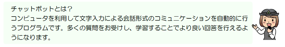 チャットボットに表示される項目から知りたいことを選択したり、キーワードを入力していただくと、選択内容等に応じて自動的に回答が表示され、知りたい情報に簡単にアクセスすることができますので、ぜひご利用ください。