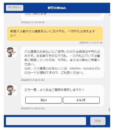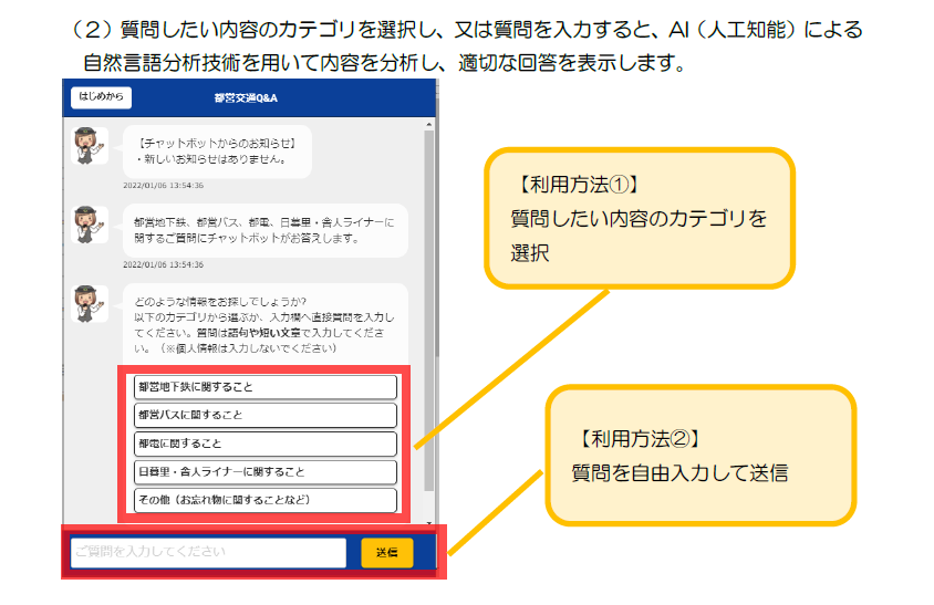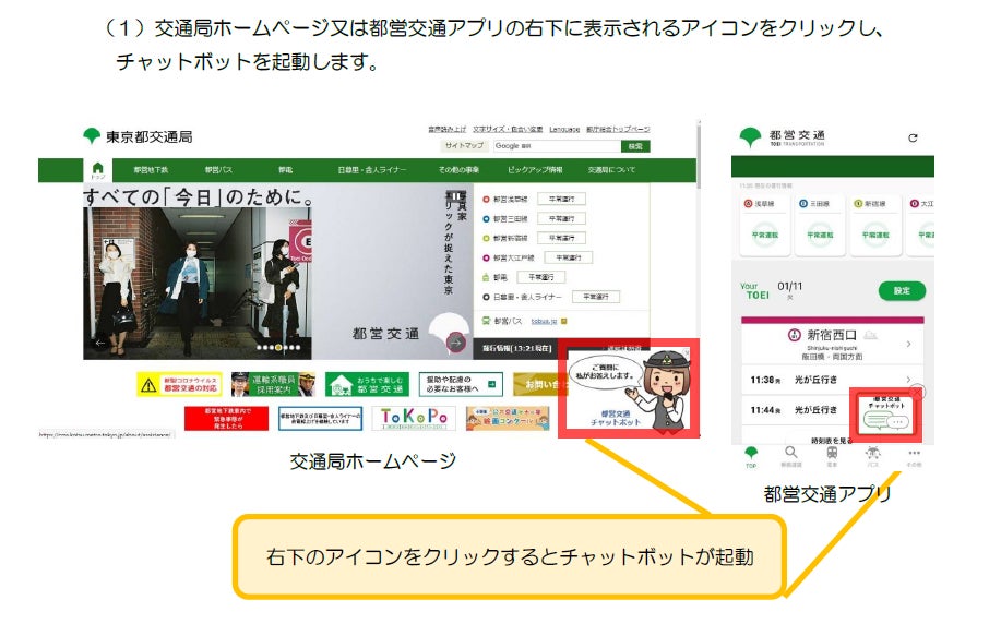 交通局では、お客様からの問合せに係るサービスのさらなる向上を図るため、当局ホームページ及び都営交通アプリ上でのチャットボットサービス「都営交通チャットボット」を令和4年1月14日から開始します。