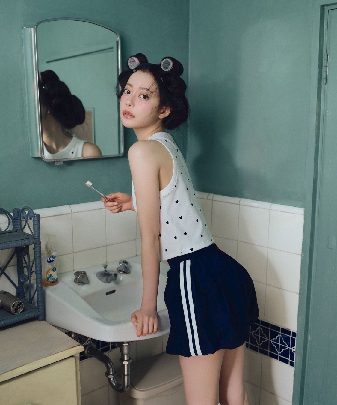 ハート柄のタンクトップに、トレンドのバルーンショートパンツを合わせてSPORTYな印象に♪