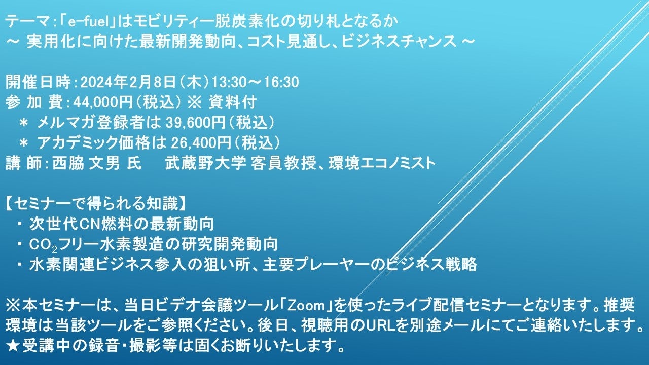 【ライブ配信セミナー】「e-fuel」はモビリティー脱炭素化の切り札となるか ~ 実用化に向けた最新開発動向、コスト見通し、ビジネスチャンス ~ 2月8日(木)開催 主催:(株)シーエムシー・リサーチ