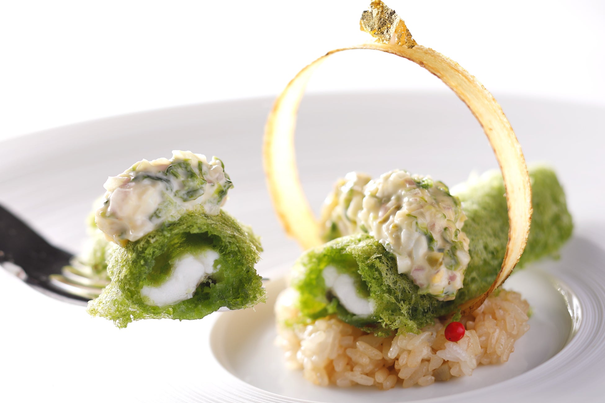 脂ののった天然穴子に、小松菜や春菊を加えた鮮やかな色合いの衣をまとわせ、爽やかな香りのフリットに仕上げました。浜名湖の岩海苔を加えたオリジナルの和風タルタルソースでご用意。