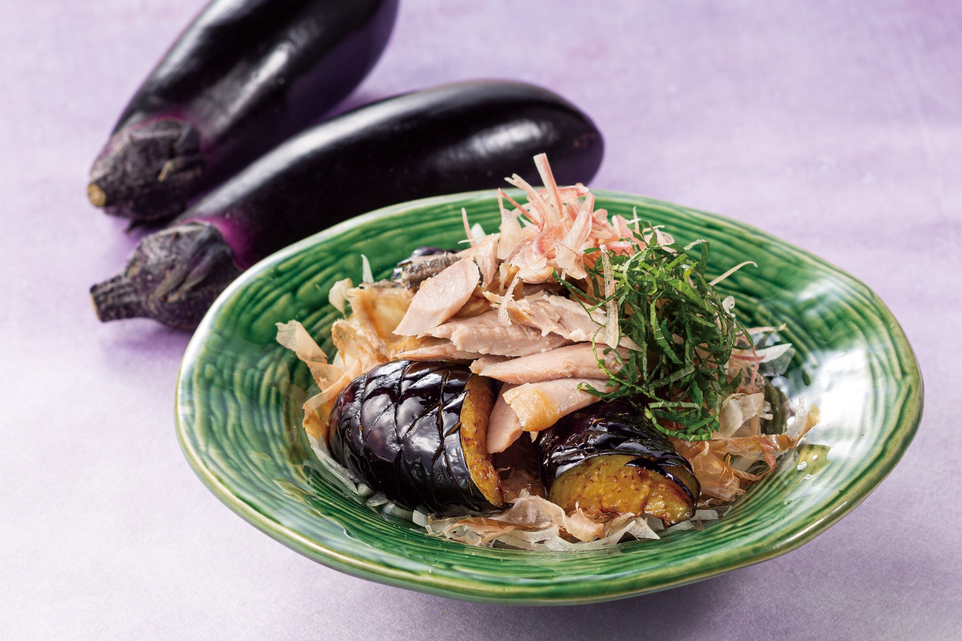 高知県の隠れたソウルフード「茄子のたたき」は油で揚げた茄子に魚と薬味をたっぷり乗せるのが地元流。旨味を感じる干した鰹のハランボ(ハラミ)とあわせました。