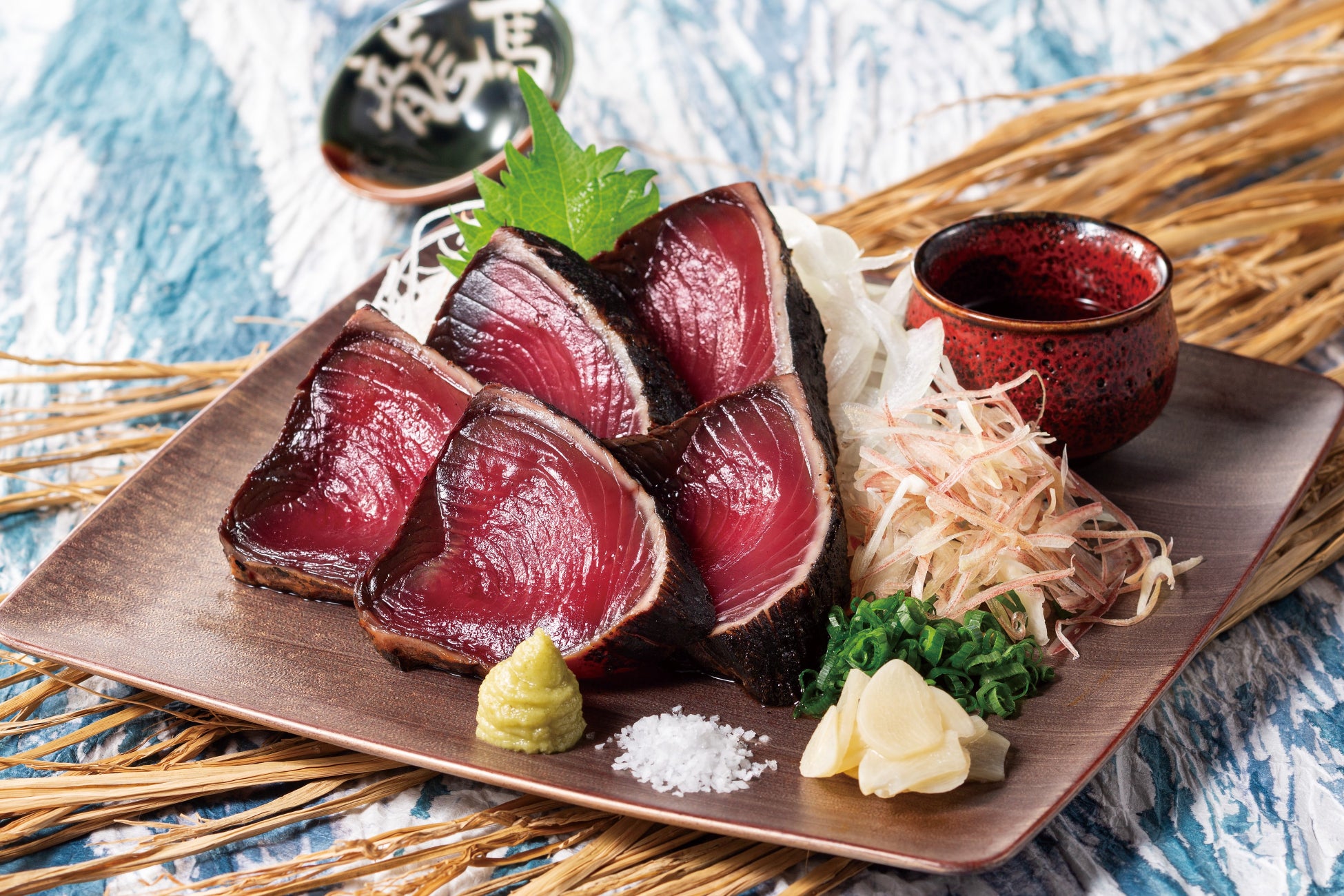 職人が最初から最後までワラで焼く土佐の伝統製法「完全ワラ焼き」ならではの香ばしさを堪能できます。まずは塩のみでシンプルに、その後は数種類の薬味でお楽しみいただくのがおすすめです。