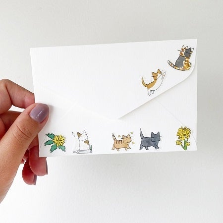 デザインは〈うきうき編〉〈まったり編〉〈わいわい編〉〈ルンルン編〉のたっぷり使える4種類です。季節の花がよく似合う、愛らしい猫たちの姿に癒やされます。