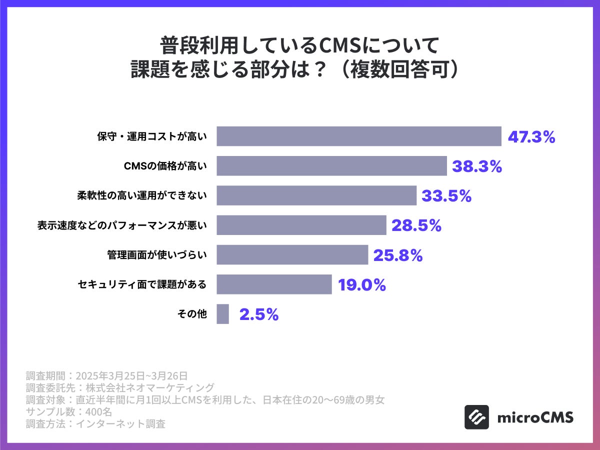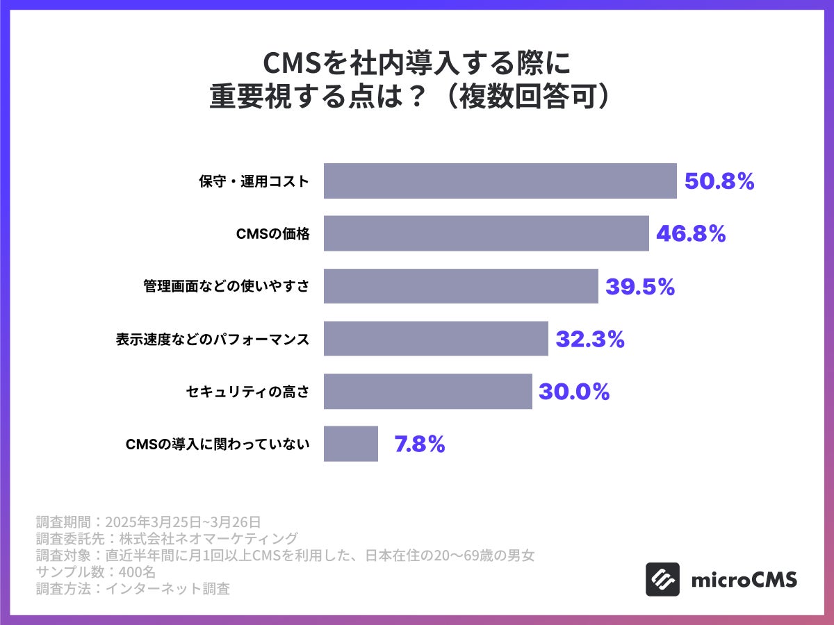 創造性と技術力で多様なITサービスを展開する株式会社エイチームホールディングスのグループ会社で、国内最大級規模(※)の利用実績を誇るヘッドレスCMS「microCMS」を運営する株式会社microCMS(本社:東京都千代田区、代表取締役:松田承一、以下当社)において、月1回以上の頻度でCMSの利用がある正社員・会社役員400人を対象に、CMSの認知度や、選定する際の判断軸に関する調査を実施しました。